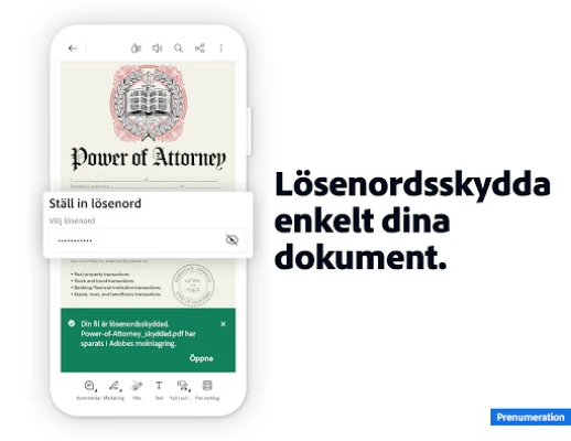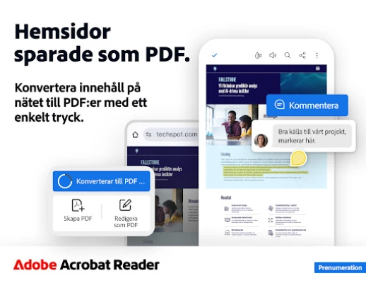 Med en prenumeration på Adobe Acrobat Reader lyfter du din dokumenthantering till nästa nivå. Förvandla appen till en komplett PDF-redigerare där du kan justera text och bilder direkt i dina dokument, korrigera stavfel eller lägga till nytt innehåll. Rotera, beskär eller ta bort bilder med lätthet. Få full kontroll över dina skannade PDF:er genom att göra texten redigerbar med optisk teckenigenkänning (OCR). Utöver detta kan du enkelt slå samman eller dela upp filer, omorganisera sidor, och konvertera en mängd olika format – från Microsoft- och Google-dokument till bilder och webbplatser – till professionella PDF:er, eller exportera dina PDF:er till Word, Excel, PowerPoint, JPG och PNG. Säkerställ dessutom att dina känsliga filer skyddas med lösenord och komprimera dem för enklare delning och lagring.