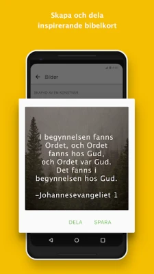 Fördjupa dig i Guds ord med Bibelappen, en omfattande digital följeslagare för din andliga resa. Oavsett om du är uppkopplad eller föredrar att studera offline, ger denna applikation dig tillgång till tusentals bibelöversättningar, inklusive populära versioner som Svenska Folkbibeln och Bibel 2000. Skapa en personlig upplevelse genom att markera betydelsefulla avsnitt med anpassade färger, lägga till egna anteckningar som antingen är privata eller delas med vänner, och spara dina favoritverser som bokmärken. Du kan till och med förvandla inspirerande bibelord till konstnärliga bilder att dela, eller integrera dem i dina egna foton. Med Bibelappen är det enkelt att göra daglig läsning till en berikande vana.