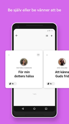 Bibelappen är mer än bara en läsapp; den är en plattform för gemenskap och bön. Utveckla en meningsfull bönepraxis genom att organisera dina förbönsämnen med digitala bönekort, hålla dem privata eller dela dem med din närmsta krets. Fira besvarade böner tillsammans och stärk era band. Fördjupa din tro genom att utforska tusentals läsplaner och andakter som täcker allt från specifika bibelböcker till relevanta livsämnen. Engagera dig i ärliga samtal om tron med vänner, dela insikter och studera sanningarna i Skriften tillsammans, vilket främjar er gemensamma andliga tillväxt.