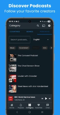 Anpassa din ljudresa precis som du vill ha den. Upptäck nya stationer genom att utforska länder, söka efter specifika genrer som "oldies" eller "rock", eller låt appen hitta lokala sändningar baserat på din position. Spara dina favoritstationer för snabb åtkomst och organisera dem i den ordning du föredrar. Med Världsradiostationer kan du till och med ställa in larm för att vakna till dina favoritprogram, eller spela in sändningar för att lyssna på senare. Utforska vad som är populärt just nu, den här veckan, månaden eller genom tiderna, och filtrera stationer alfabetiskt eller efter senast tillagda. Dessutom kan du lägga till dina egna radiostationer och njuta av appen på över 30 språk med anpassningsbara teman som Blå Himmel, Ljus och Mörk. Och oroa dig inte för att missa något – uppspelningen pausas automatiskt vid inkommande samtal och återupptas när du är klar. En aktiv internetanslutning krävs för att strömma liveinnehåll.