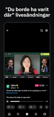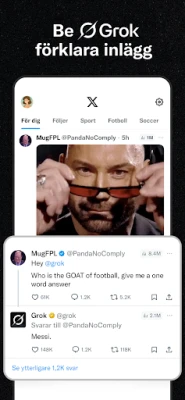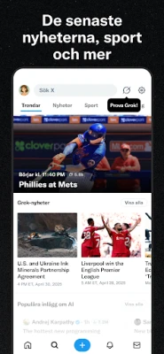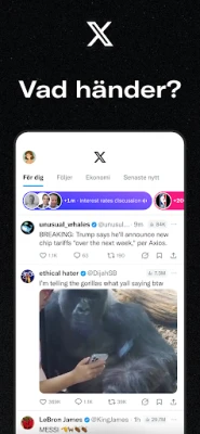 Upptäck X, ditt globala digitala stortorg. Delta i offentliga samtal, håll dig informerad om nyheter och följ dina intressen. Sänd live, kommunicera privat och utforska grupper. Med X kan du också skapa långa inlägg och tjäna pengar på ditt innehåll.